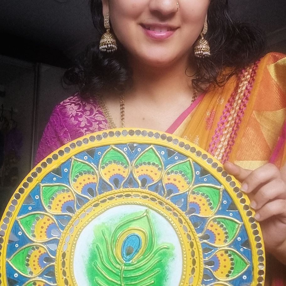 A central peacock feather is framed by repeating peacock‑eye motifs in green, blue and mustard, shown here with the artist in festive attire for added cultural context. Use this image for Janmashtami and spiritual‑gifting listings to showcase how beautifully the plate pairs with traditional outfits and pooja setups.